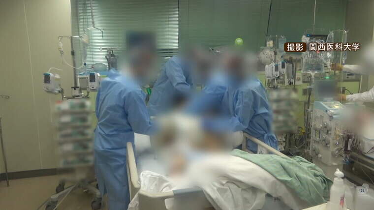 大阪府守口市の関西医科大学総合医療センターで撮影された映像。防護服に身を包んだ医師や看護師がコロナ重症患者の痰を吸引しています。肺に水がたまらないように患者をうつぶせにしますが4人がかりの作業です。