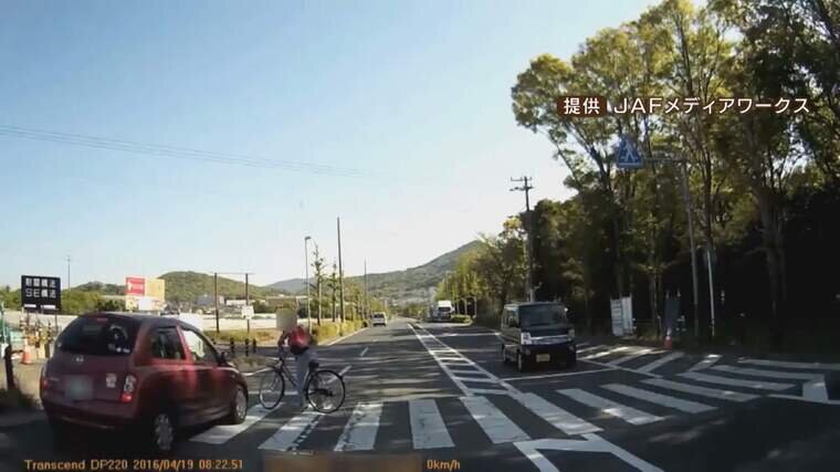 こちらの車のドライブレコーダーの映像には、横断歩道を渡ろうとする自転車を確認。対向車も停止し、自転車が渡り始めます。すると、第一走行車線から車が突っ込んできて、あわや接触しそうになりました。ぎりぎりで事故は起きませんでした。