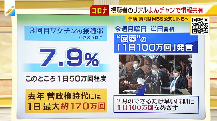 「3回目接種って今どれぐらい打てているのか。2月10日時点で接種率は7.9%です。このところ1日50万回程度、日本では接種できています。去年の菅政権時代には1日最大で約170万回打てていた時期がありました。3回目接種でいうと、例えばイスラエルは去年の7月に3回目接種が始まっています。その後、8月以降はもうアメリカもイギリスも追加接種が始まっています。日本は年が明けてからですよね。このスピード感をどう考えるか。2月7日に岸田文雄首相は『屈辱の1日100万回発言』があったということですが、三澤さん、これは何が屈辱なんでしょうか?」