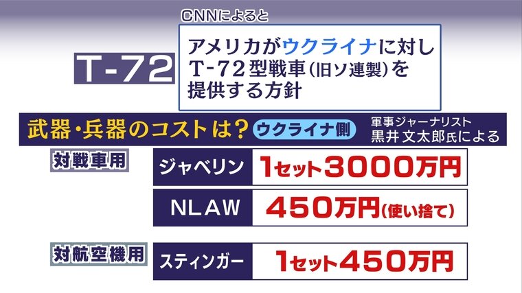 ―――イギリスのインディペンデント紙は、ロシアの軍用車両2055台が破壊されたと報じています。この武器・兵器のコストなんですが、黒江さん曰く、戦車ですと「T‐72」といわれるものが旧型で1億数千万円、新型では4億数千万円もするということで、戦車を作る費用は莫大なんですね?