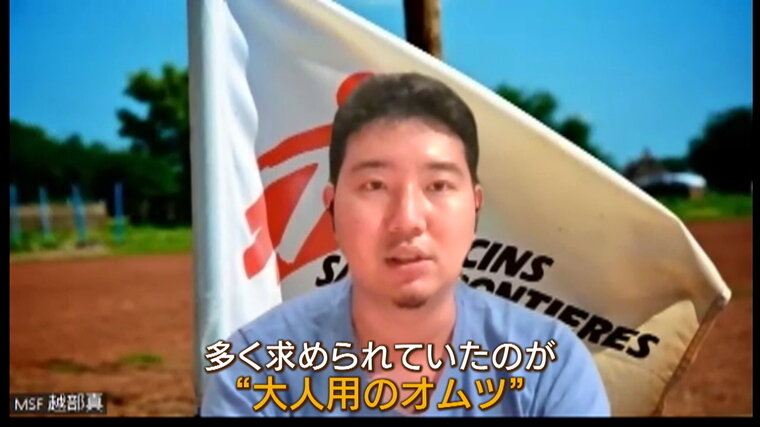 「オムツとかだと合計で5000パックとか。床用洗剤とかそういったものは500kgとか。(Q500kg!?)5リットル入るポリタンクみたいなのを500個みたいな。そのうち100個しか送れませんみたいなことがありました。できる限り物資をかきあつめて現場に送るんですけど、(必要な)物を送れなかったのはすごく悔しかったですし、今でも心残りではあります。(Q特に不足していた物資は?)多く求められていたのが“大人用のオムツ”。(Q子ども用じゃなくて大人用?)そうですね。子ども用も送ったんです、もちろん。ただ、量としては大人用のオムツがすごく多かったです。子どもたちはお母さんと一緒に逃げているケースが比較的多かったんです。なので現地に残っているのが慢性疾患のある高齢者の方とか、1人では動けないような方たちが(現地に)残っていたんですね。そういった方たちが日常的に使うオムツというのが一番求められていましたし、その人たちを後方に移送するにあたってもオムツが必要とされていたんですね」