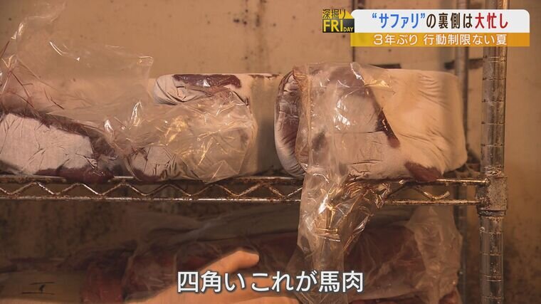 「エサをいれる冷蔵庫です。結構、大きいです。四角いこれが馬肉です。その左にあるのは牛肉です。半分はミンチにして、カルシウムとかを入れます。何種類かあるんですけど。(Q飼料高騰の影響は?)多少はある。節約するところはしています。嗜好性が高いもの、値段も、それは減らしたりしている」