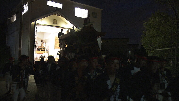 「現在、時刻は午前5時5分です。早朝にもかかわらず、今だんじり小屋から大きなだんじりがひき出されました」