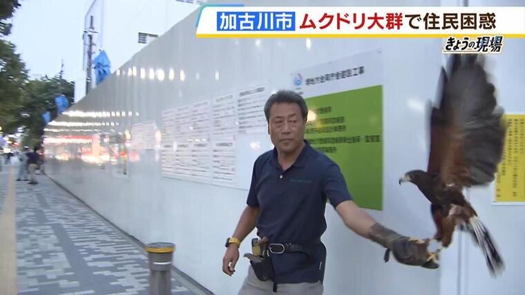 模型がダメならと、大阪府堺市では2013年、天敵のタカを投入して徹底抗戦。驚いたムクドリは一気に舞い上がるなどしましたが効果は一時的でした。