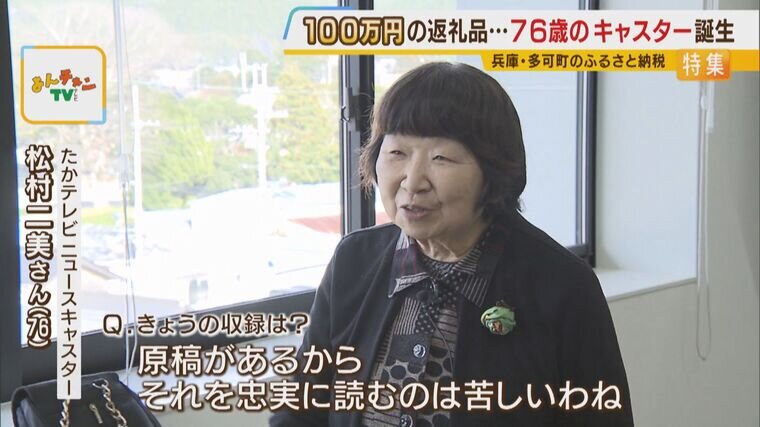 ふるさと納税の返礼品といえば、お肉・海産物・その地の名産品などが人気ですが…兵庫県・多可町に変わった返礼品があります。それは「1年間ニュースキャスターになれる券」です。寄付額はなんと100万円!今回この返礼品でキャスターになった76歳の女性を取材しました。