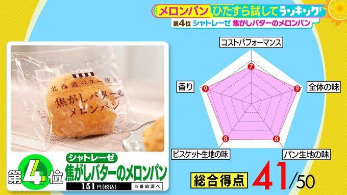 第4位は、シャトレーゼの『焦がしバターのメロンパン』(税込151円 ※番組調べ)。