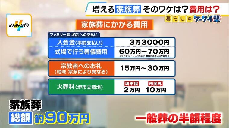 最近、急増している家族葬。インターネットで検索すると多くの葬儀会社で取り扱っています。一体、どんなお葬式なのか、堺市にある家族葬専門の式場「ファミリー葬 堺店」に行ってみると…