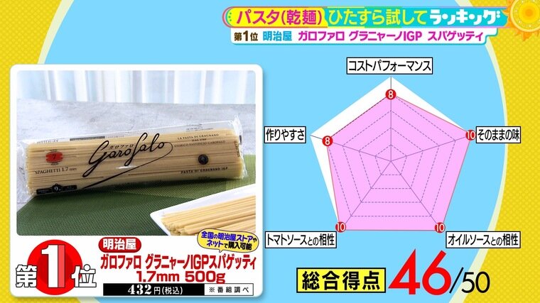 そして第1位は、明治屋の『ガロファロ グラニャーノ IGP スパゲッティ 1.7mm 500g』(税込432円 ※番組調べ)。