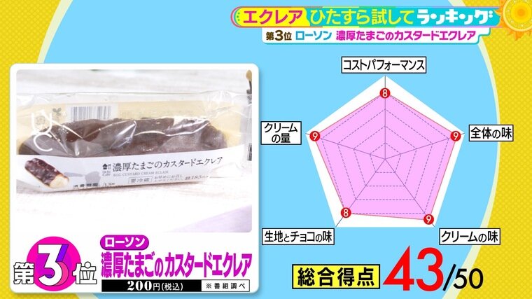 第3位は、ローソンの『濃厚たまごのカスタードエクレア』(税込200円 ※番組調べ)。