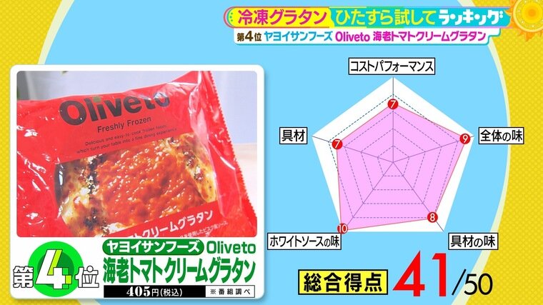 第4位は、ヤヨイサンフーズの『Oliveto 海老トマトクリームグラタン』(税込405円 ※番組調べ)。