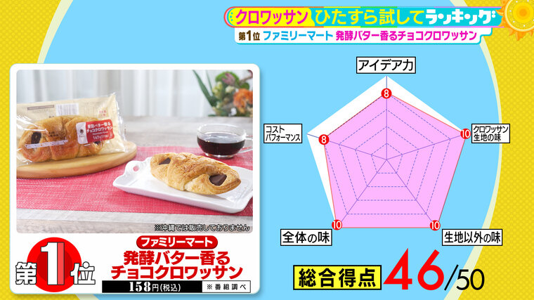 そして第1位は、ファミリーマートの『発酵バター香るチョコクロワッサン』(税込158円 ※番組調べ ※沖縄では販売しておりません)。