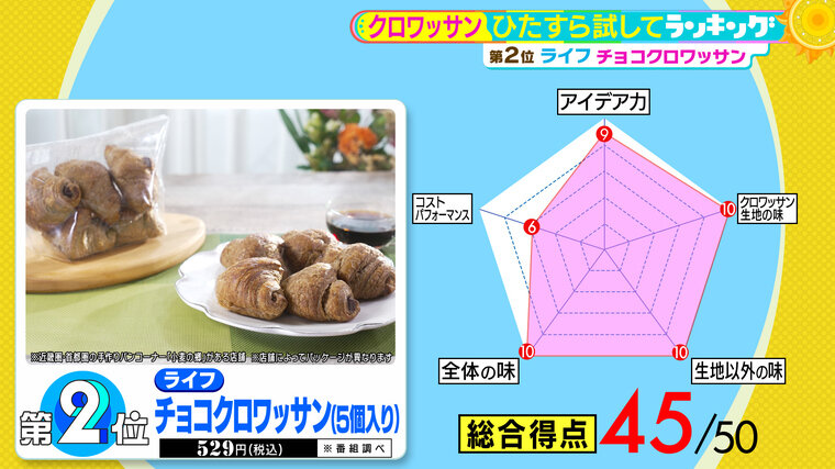 第2位は、ライフの『チョコクロワッサン(5個入り)』(税込529円 ※番組調べ ※近畿圏・首都圏の手作りパンコーナー「小麦の郷」がある店舗 ※店舗によってパッケージが異なります)。
