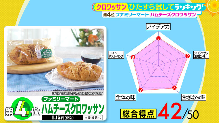 第4位は、ファミリーマートの『ハムチーズクロワッサン』(税込145円 ※番組調べ ※沖縄では商品仕様と価格が異なります)。