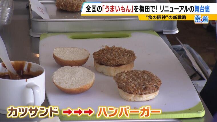 名物のカツサンドをアレンジしハンバーガーをつくります。「うまいもんみっけ」でしか買えない目玉商品です。