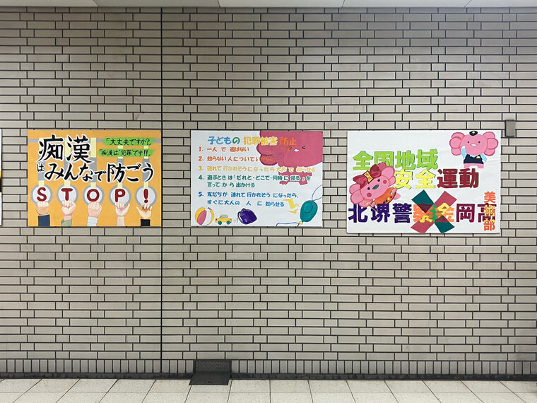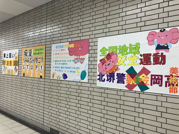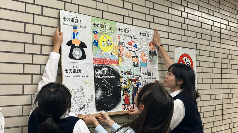 堺市北区の新金岡駅では10月10日、特殊詐欺の被害や子どもの犯罪被害などを防ごうと、府立金岡高校の美術部が制作したポスターが展示されました。