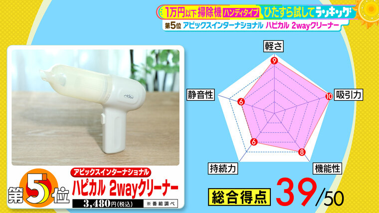 第5位は、アピックスインターナショナルの『ハピカル 2wayクリーナー』(税込3,480円 ※番組調べ)。