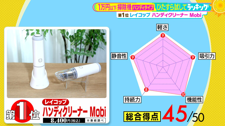 そして第1位は、レイコップの『ハンディクリーナー Mobi』(税込8,400円 ※番組調べ)。