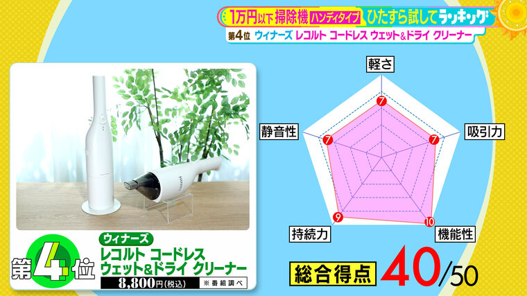 第4位は、ウィナーズの『レコルト コードレス ウェット&ドライ クリーナー』(税込8,800円 ※番組調べ)。