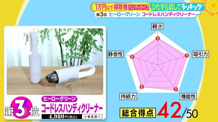 第3位は、ヒーローグリーンの『コードレスハンディクリーナー』(税込4,980円 ※番組調べ)。