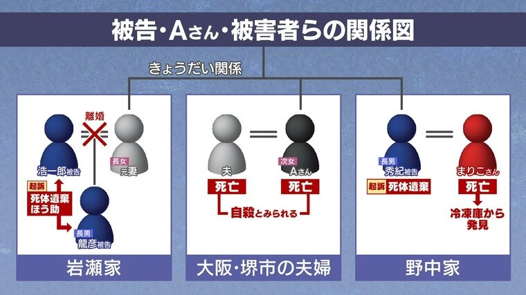 この死体遺棄に関与したとして、住人の岩瀬浩一郎被告(73)と息子の龍彦被告(49)、そしてAさんの実弟・野中秀紀被告(63)が逮捕された。