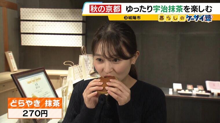 上田芹莉アナウンサーが、特別に店先で「どらやき 抹茶」を試食しました。