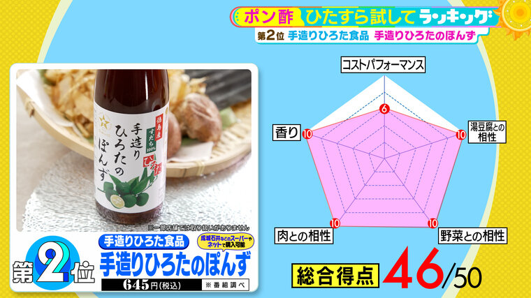 第2位は、手造りひろた食品の『手造りひろたのぽんず』(税込645円 ※番組調べ ※一部店舗では取り扱いがありません)。