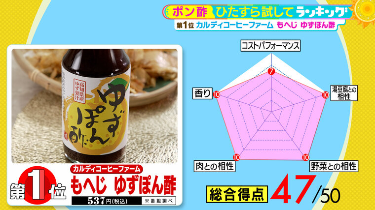 「コストパフォーマンス」以外のすべての項目が満点で、「肉との相性」は1位に。徳島県産すだちを100%使用し、すだち本来の香りとまろやかな酸味が楽しめる。「野菜との相性」のチェックでは、佐々木さんが野菜の甘みを引き出す点を絶賛。「これを作った人はなかなかですね」と舌を巻いた。出汁には厳選した羅臼昆布、かつお、椎茸を使用し、濃厚でコクのある深いうま味を演出。