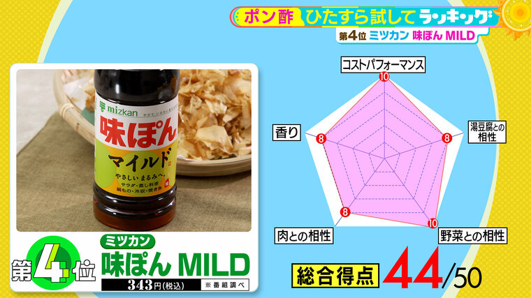 第4位は、ミツカンの『味ぽんMILD』(税込343円 ※番組調べ)。