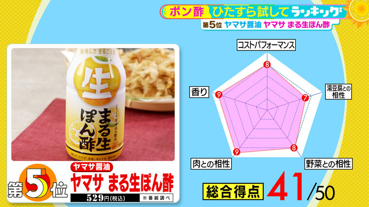 第5位は、ヤマサ醤油の『ヤマサ まる生ぽん酢』(税込529円 ※番組調べ)。