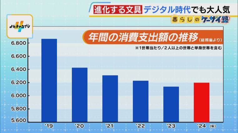 デジタルにない良さがあらためて見直されているアナログ文具。家計における文具への出費でみると去年、5年ぶりの増加に転じています(年間の消費支出額の推移 総務省より)。