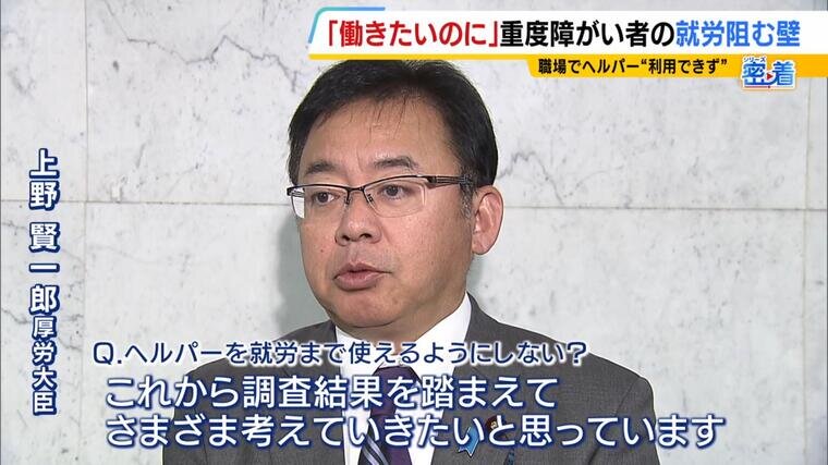 (上野賢一郎厚労大臣)「この課題を本当にわれわれも重要な問題だと認識しておりますので、国としての対応をこれからどうするか、調査結果も踏まえて十分に検討していきたいと思います。(Qヘルパーを就労まで使えるようにしない?)これから調査結果を踏まえて、さまざま考えていきたいと思っています」