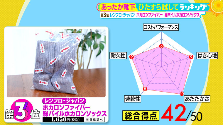 第3位は、レンフロ・ジャパンの『ホカロンファイバー 総パイルホカロンソックス』(税込1,650円 ※番組調べ)。
