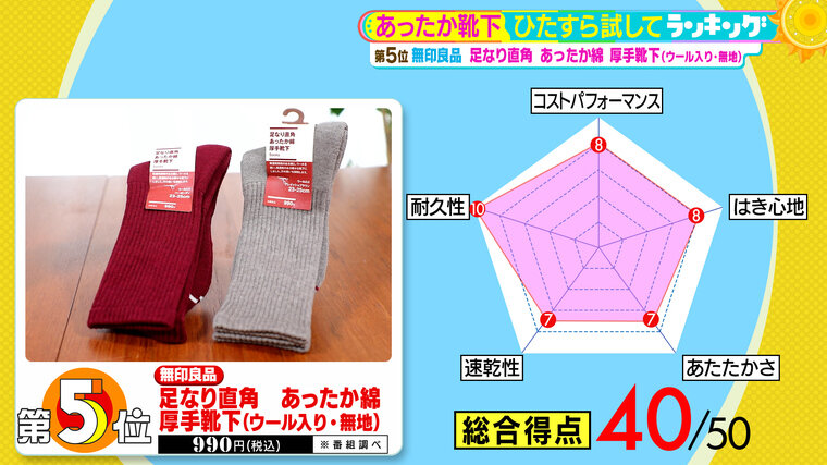 第5位は、無印良品の『足なり直角 あったか綿 厚手靴下(ウール入り・無地)』(税込990円 ※番組調べ)。