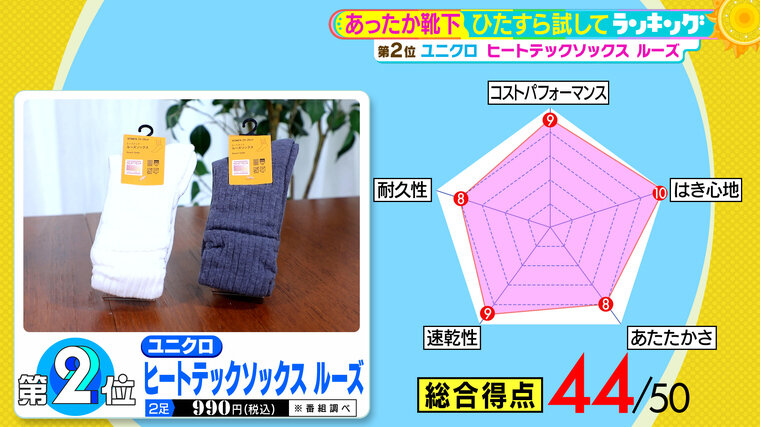 第2位は、ユニクロの『ヒートテックソックス ルーズ』(2足 税込990円 ※番組調べ)。