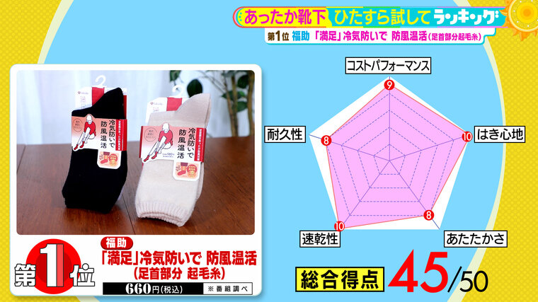 そして第1位は、福助の『「満足」 冷気防いで 防風温活(足首部分 起毛糸)』(税込660円 ※番組調べ)。