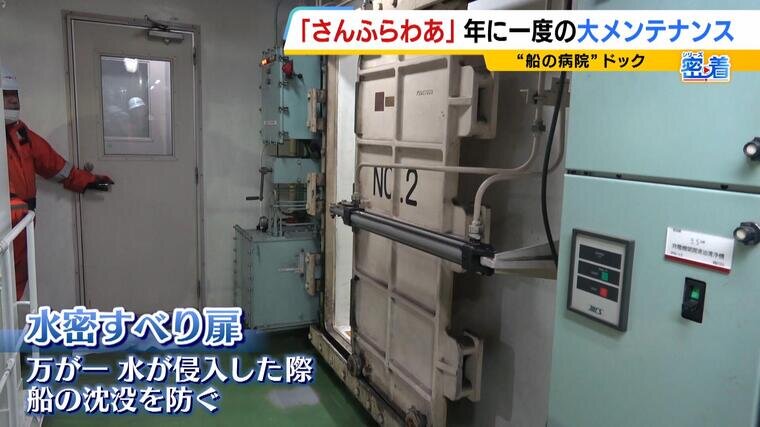 万が一、水が侵入した際に船の沈没を防ぐための「水密すべり扉」という装置。船内は14の区画に分かれていて、もし、水が浸入してもこの扉を閉めることで浸水がほかの区画に広がることを防ぎます。