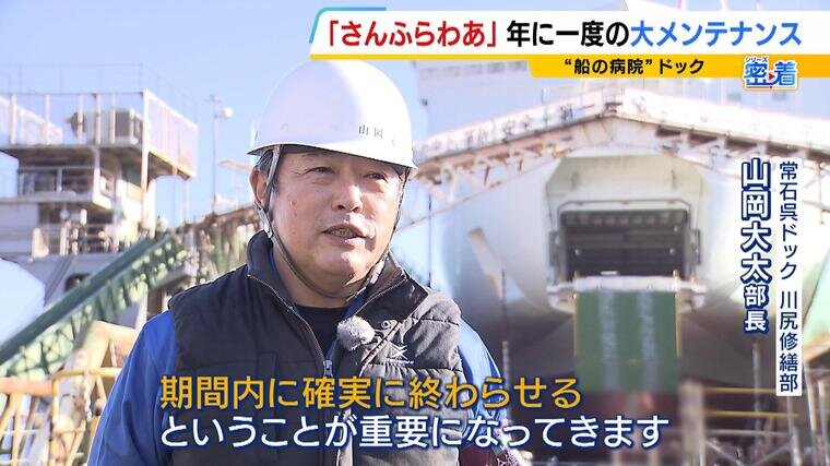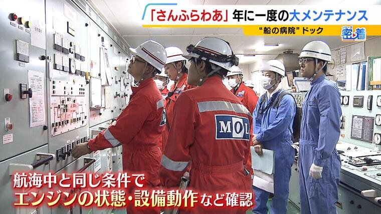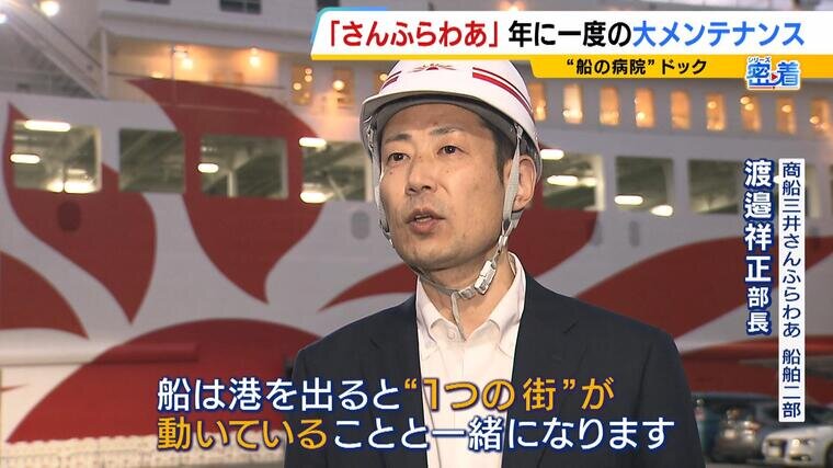 (商船三井さんふらわあ・船舶二部 渡邉祥正部長)「船は港を出ると“1つの街”が動いていることと一緒になりますので、インフラ的なところも船内ですべて賄わないといけない。不具合を見つけるチャンスはドックが一番大きくて、そこできちんとなおす、メンテナンスをすると、間違いなく安全に運航できると思っています」