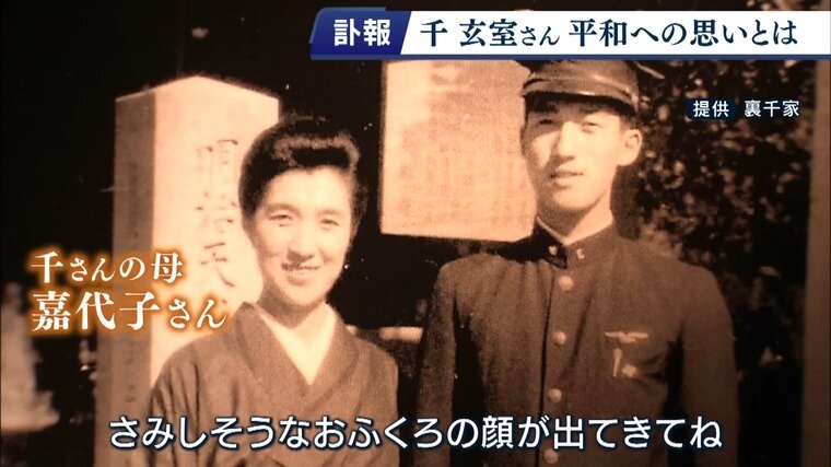 京都の茶道・裏千家の15代家元で、今年8月に102歳で亡くなった千玄室さん。旧日本海軍の元特攻隊員でもあった。MBSは、千玄室さんが亡くなる約2か月前の6月16日に取材を行っていた。テレビカメラを前に語ったのは最後の機会だったとみられる。戦後80年という節目の年の瀬、約1時間の単独インタビューの全文をもとに、現代を生きる私たちへの「遺言」とも言えるメッセージを振り返る。陣中で開いた茶会で戦友らが口々に「お母さーん」と叫んだ光景をはっきりとした口調で語った千さん。インタビューを続けるうち、戦後に取り組んだ茶道による「ピースフルネス」や、「特攻はテロ」との言説に怒ったエピソードにも言及していく。