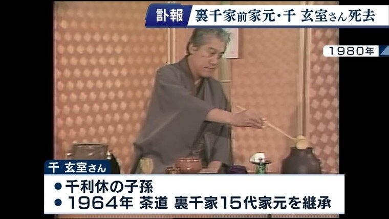 【千玄室さん】大正12年生まれ。茶道・裏千家の15代家元を継承し、1997年には文化勲章を受章、茶道の普及に貢献。2002年、家元を長男に譲る。太平洋戦争中は海軍の元特攻隊員で戦後は、茶道を通して平和を訴える活動を続ける。今年5月に転倒して京都市内の病院に入院、8月14日未明に102歳で死去。