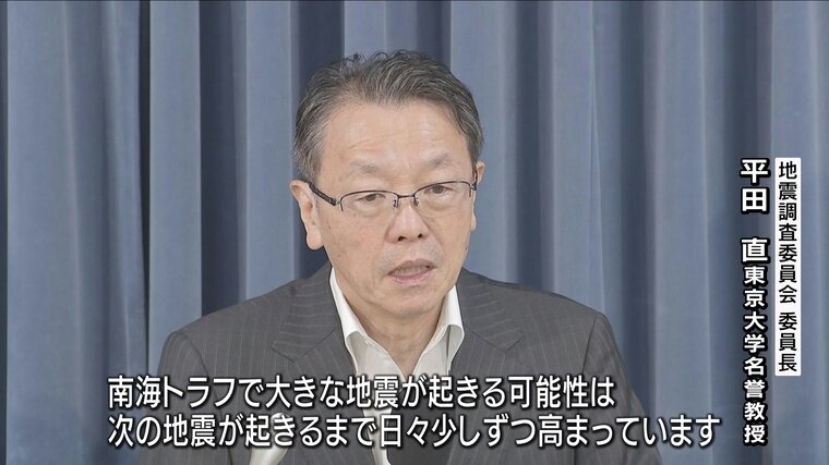 国の地震調査委員会の会長で東京大学の平田直名誉教授は、「南海トラフで大きな地震が起きる可能性は、次の地震が起きるまで日々少しずつですが高まっています。下がることはありません」と、強調しました。