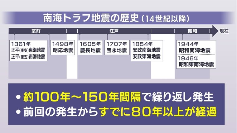 南海トラフ地震は、概ね100~150年間隔で繰り返し発生してきました。たとえば、江戸時代に発生した南海トラフ地震である「慶長地震(1605年)」と「宝永地震(1707年)」の間は102年で、同じく「宝永地震」と「安政地震(1854年)」までは148年、そして「安政地震」と「昭和(東南海・南海)地震(1944・46年)」は90~92年となっています。