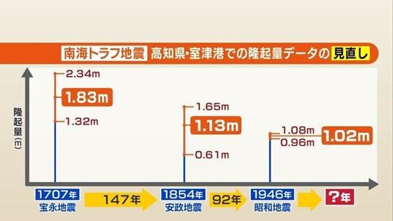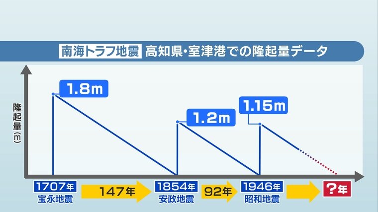 南海トラフ地震は周期的に発生していて、高知県室戸市の室津港では地震により隆起した高さ(隆起量)を記録した史料が残され、時間予測モデルに用いられています。その隆起量は、宝永地震で1.8m、安政地震で1.2m、昭和地震で1.15mとのデータを採用していました。