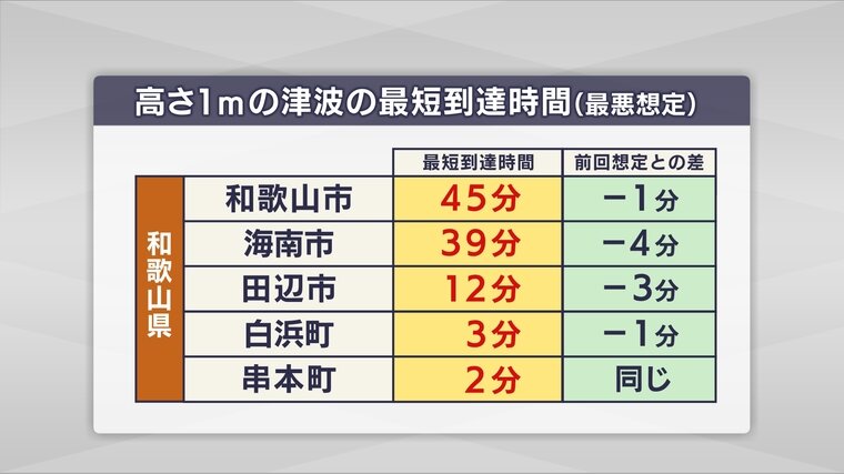 和歌山県では、和歌山市など14市町で津波到達が1分以上早くなる想定です。白浜町とすさみ町は1分早くなり、地震発生後3分に。那智勝浦町・太地町・串本町の想定は早くなってはいませんが、そもそも那智勝浦町は3分後、太地町と串本町は2分後と、非常に厳しい想定は変わりません。