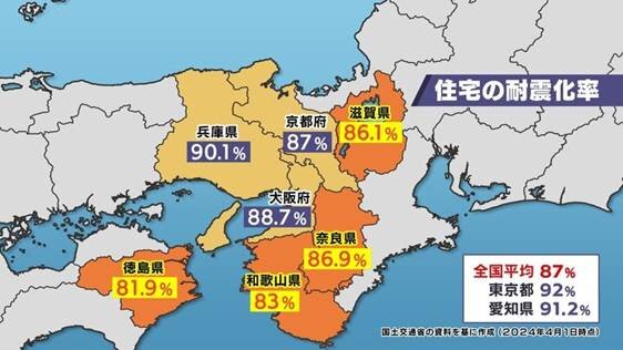 近畿・徳島の耐震化率は、全国平均の87%を大阪府(88.7%)や兵庫県(90.1%)では上回っていて、東京都(92%)や愛知県(91.2)も全国平均を上回っています。和歌山や徳島など南海トラフ地震の被害が大きいとされる地域では平均を下回っているのです。