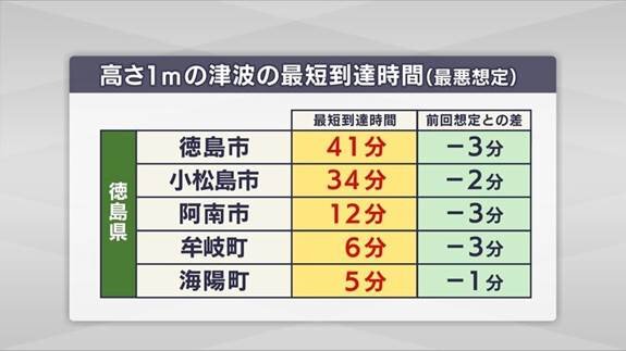徳島県では、沿岸すべての8市町で津波到達時間が早くなりました。南部の牟岐町で3分早くなり地震から6分後、海陽町で1分早くなり5分後と、さらに厳しい想定になったため、県は津波避難の周知・啓発を進めていきたいと警戒を強めています。
