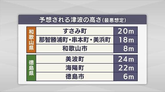 さらに、和歌山県や徳島県での最大津波は、極めて高い想定です。和歌山県すさみ町で20m、那智勝浦町や串本町などで18m。徳島県美波町は24mなどとなっています。都市部では、和歌山市8m、徳島市6m、大阪市5m、神戸市4mと、決して油断できません。