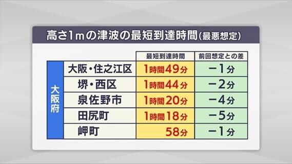 地震からおよそ1時間後の津波到達が想定されている大阪府内でも11市町で早くなっていて、泉佐野市では4分、田尻町では5分も早くなりました。