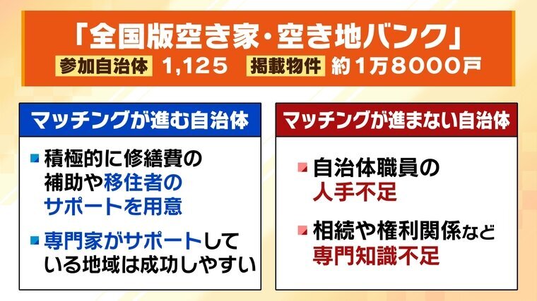 また、国交省は「全国版 空き家・空き地バンク」の運用を開始。参加自治体は1125、掲載物件は約1万8000戸にのぼっていますが(2025年11月現在)、空き家のマッチングが進む自治体・進まない自治体、それぞれに特徴があるということです。