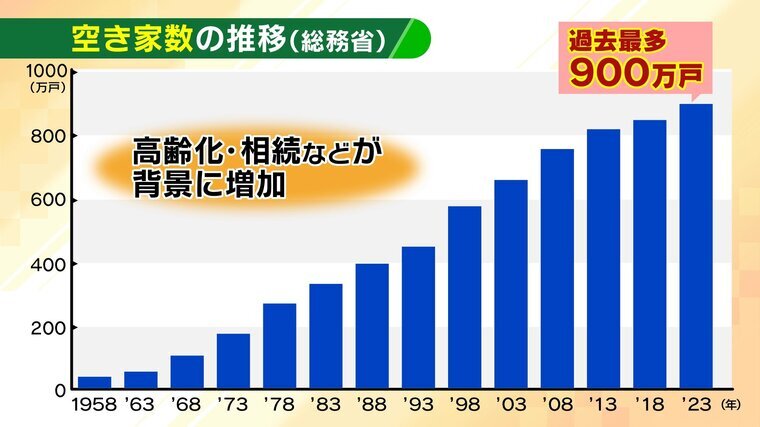 総務省によると、1958年以降、空き家数は右肩上がりで増加していて、2023年時点は過去最多の900万戸を記録。都市部では団地・ニュータウンなどで増えているようです。