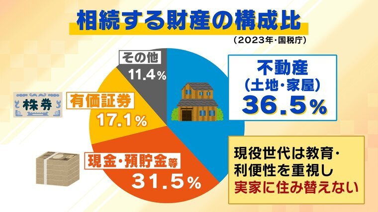 空き家増加の背景にあるのが「相続」の問題です。相続財産の構成比(2023年・国税庁)を見ると、最も多いのは不動産(土地・家屋)で、36.5%を占めています。